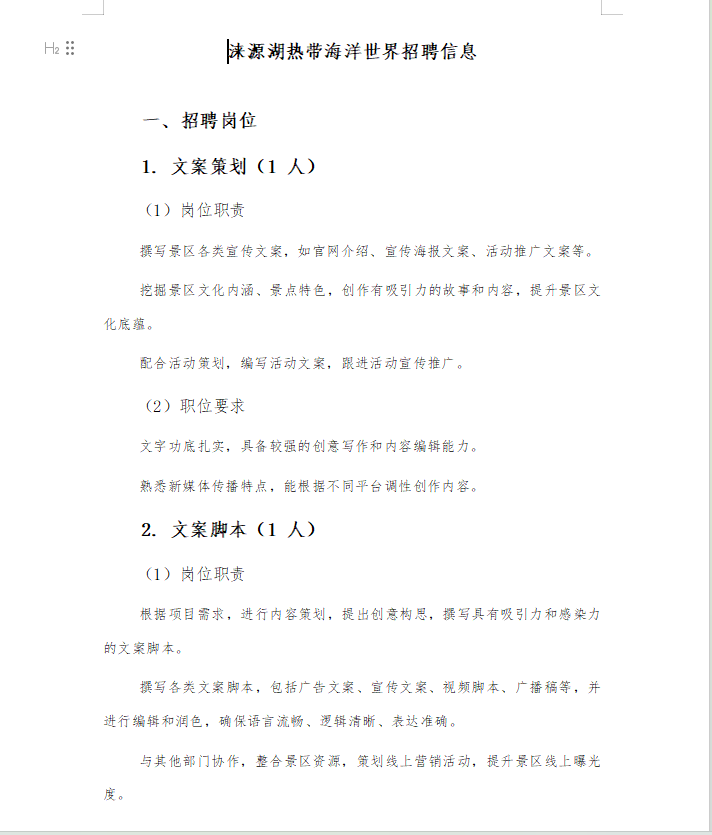 涞源县宏伟置业房地产开发有限公司涞源湖热带海洋世界数字科技分公司,是涞源县宏伟集团投资4.7亿,历时三年建造而成,总建设面积3万平米,日接待量可达8000人次,四季恒温运营模式,填补北方冬季亲水文旅空白,实现“全年无休,全龄畅玩”,以AR数字为核心打造的沉浸式热带海洋世界,实现4大数字科技应用。此外还有涞源湖旅游度假区,公司还有房地产、酒店、餐饮等业态,营销策划部正在招聘平面设计、文案、摄影、剪辑、主播、渠道专员等岗位。