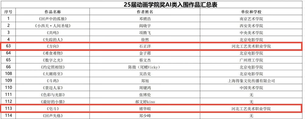近日,第25届北京电影学院动画学院奖入围名单公布,我校数字艺术设计系动漫设计(中韩合作)专业2024级学生石正洋、褚华暄创作投递的两部作品成功入围AI短片赛道。