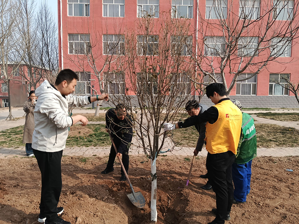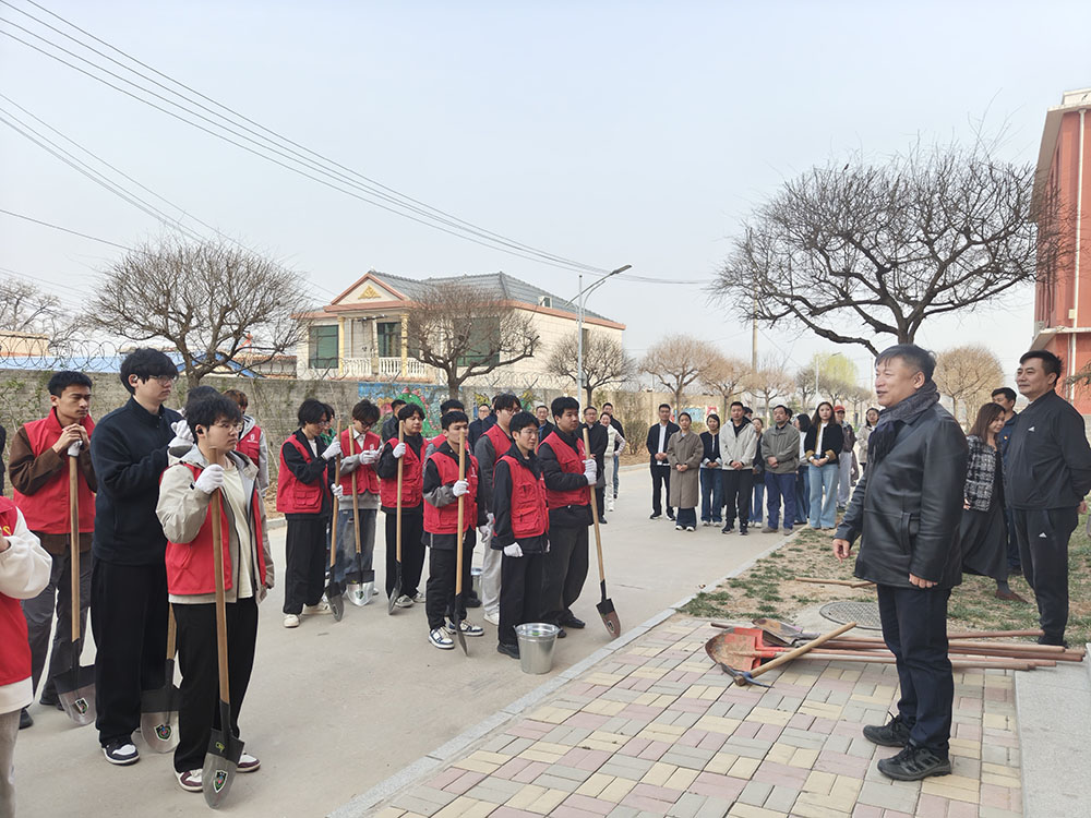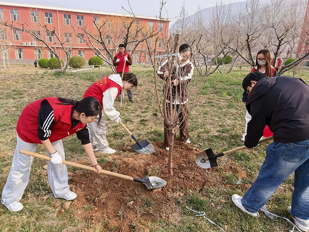 活动现场,师生们热情饱满、干劲昂扬。院领导率先垂范,与同学们并肩劳作,挖坑、扶苗、培土、浇水,每一步都细致认真。大家分工有序、配合默契,新植的金桂挺立风中,桃树与樱花错落相间,月季含苞待放,劳动的身影与点点新绿交织成春日校园里一幅生动的画卷,静候花香满园、绿意绵延。