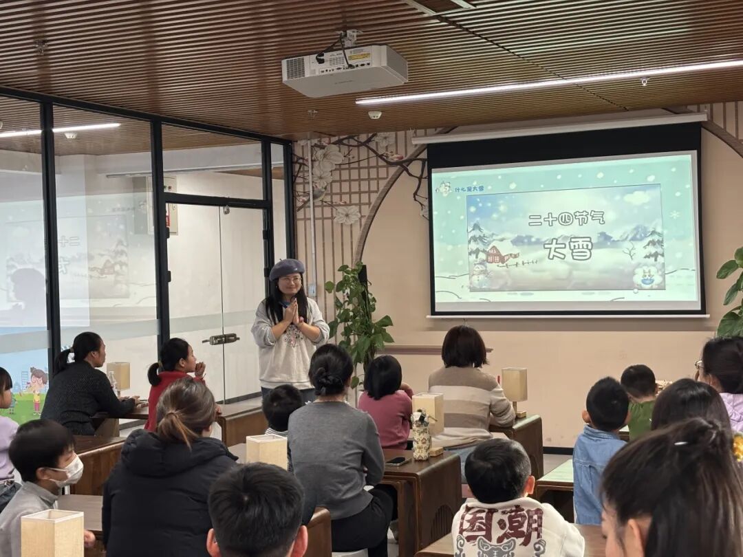 本次活动主题为“大雪至,健康驻”。老师向参与活动的读者讲述了关于大雪的节气知识,小朋友们在节气知识讲授中感受自然律动。