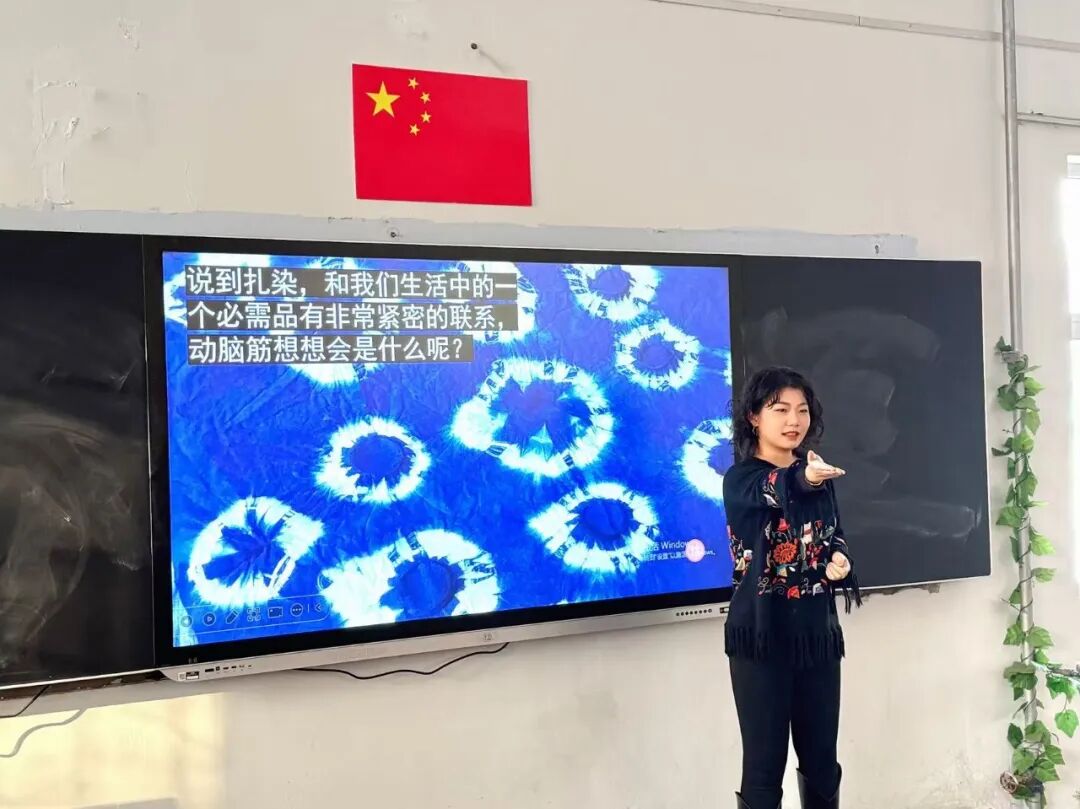在作品赏析环节,张彭云老师展示了传统扎染的纹样与工艺,并结合当代创作,介绍了扎染在现代服饰、家居、艺术展览等领域的应用。她还向同学们展示了为献礼北京冬奥会创作的大理白族扎染作品《冰雪荣光 魅力冬奥》,将传统技艺与时代主题完美融合,让孩子们感受到非遗鲜活的生命力与创造力。