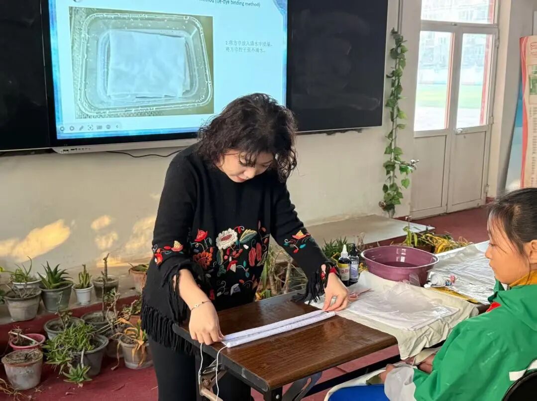 在详细讲解“夹染法”和“捆扎法”两种基本技法后,张老师进行了扎染方巾的现场示范。通过折叠、夹固、捆扎、浸染等步骤,引导同学们观察色彩的变化与纹样的生成。
