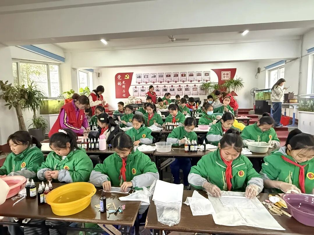本次活动由支部教师张雅迪、张彭云、杨彤旭带领学生志愿者共同组织,面向实验小学五年级学生,通过讲解、示范与实践相结合的方式,带领孩子们领略扎染技艺的千年魅力,体验手工创作的乐趣。