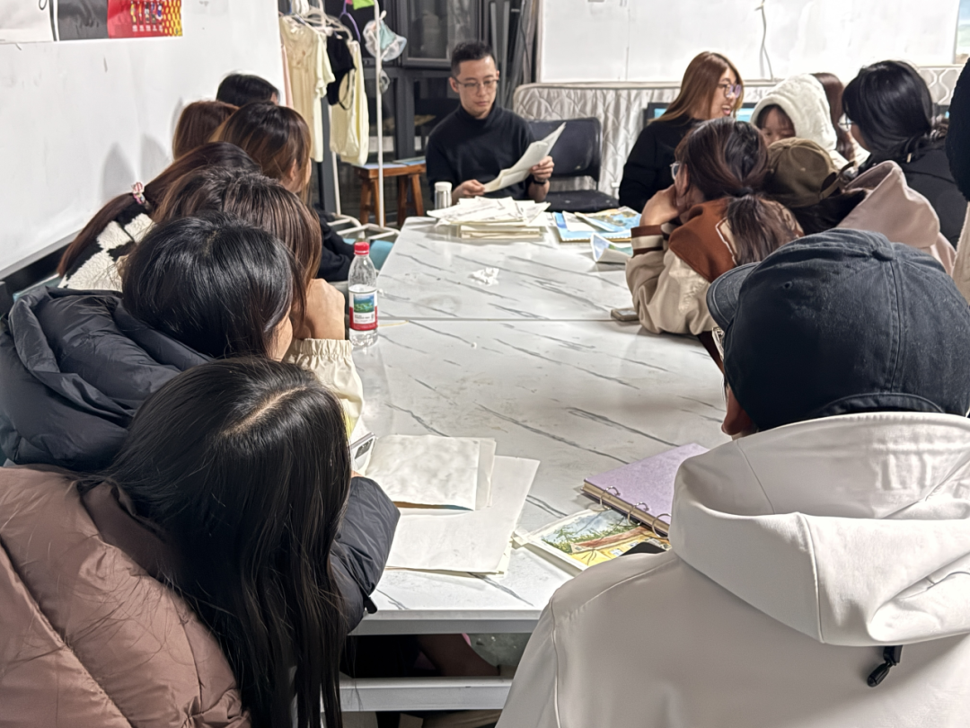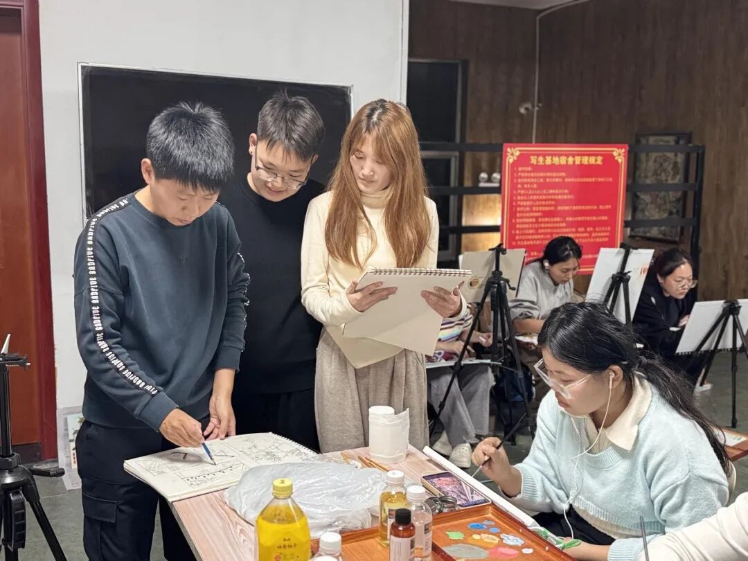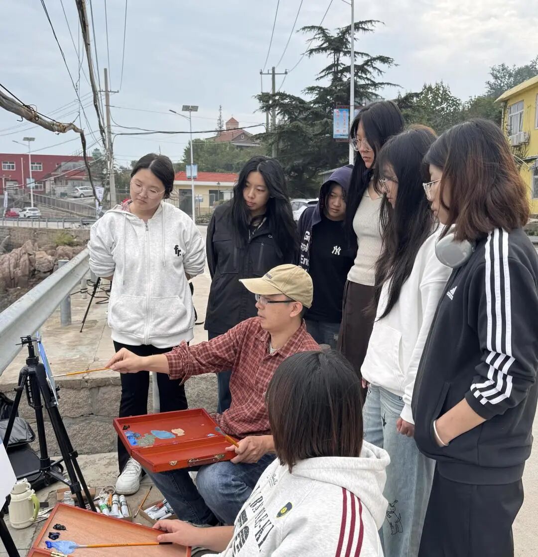 崂山依山傍海、云雾缭绕,山海相映,景致如画。写生期间,指导教师全程带队,从选景构图到色彩调和,从光影变化到情感表达,悉心示范、耐心指导。学生们在老师引领下深入自然,观察光色变化,体会笔触节奏,在实践中不断提升对艺术语言的理解与运用。白天,教师带领学生走进不同景点,现场讲解创作要点,帮助他们在真实的自然环境中锻炼观察与表达能力;夜晚,师生共同进行集中点评,教师逐一分析学生作品,从画面结构、笔法运用到整体气韵进行细致讲评,指导学生在思考与交流中不断进步。