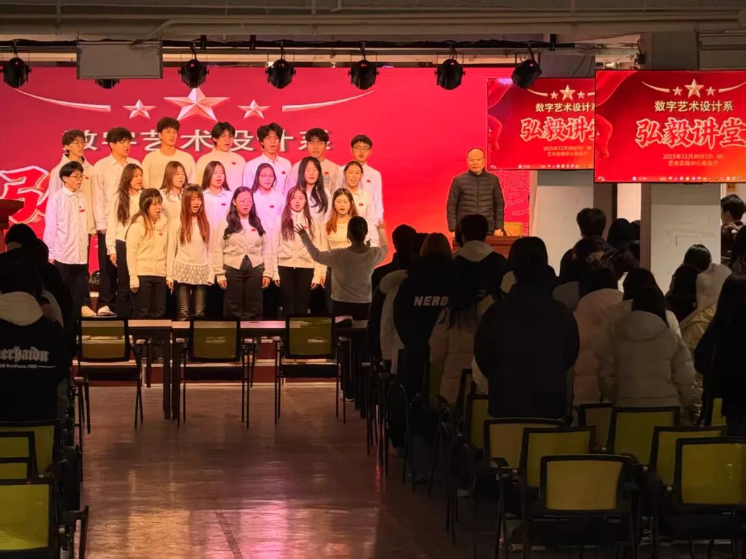 最后,全体人员起立,数字艺术设计系“矢量旋律合唱团”共同高唱《歌唱祖国》,在歌声中抒发对祖国和人民的爱,表达了为国发奋的志向,宣示了笃实前行的决心。